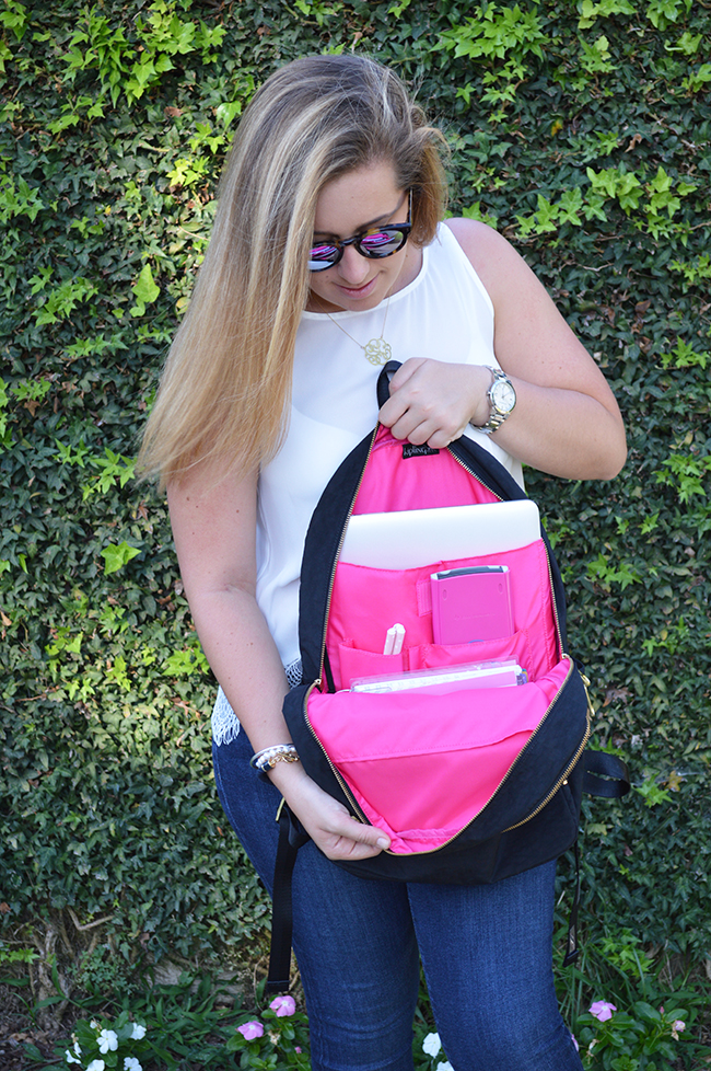 How fun is the hot pink lining? I’m absolutely in love with it! I think it’s the perfect splash of color to make you happy every time you pull something out of your backpack. That must be why they say #KiplingMakeHappy, right? One of my favorite parts of the backpack (besides the pink, obviously) is all the storage! There’s basically a pocket for everything and not only does it fit my 15″ laptop, it also has plenty of room for a couple notebooks and my agenda!